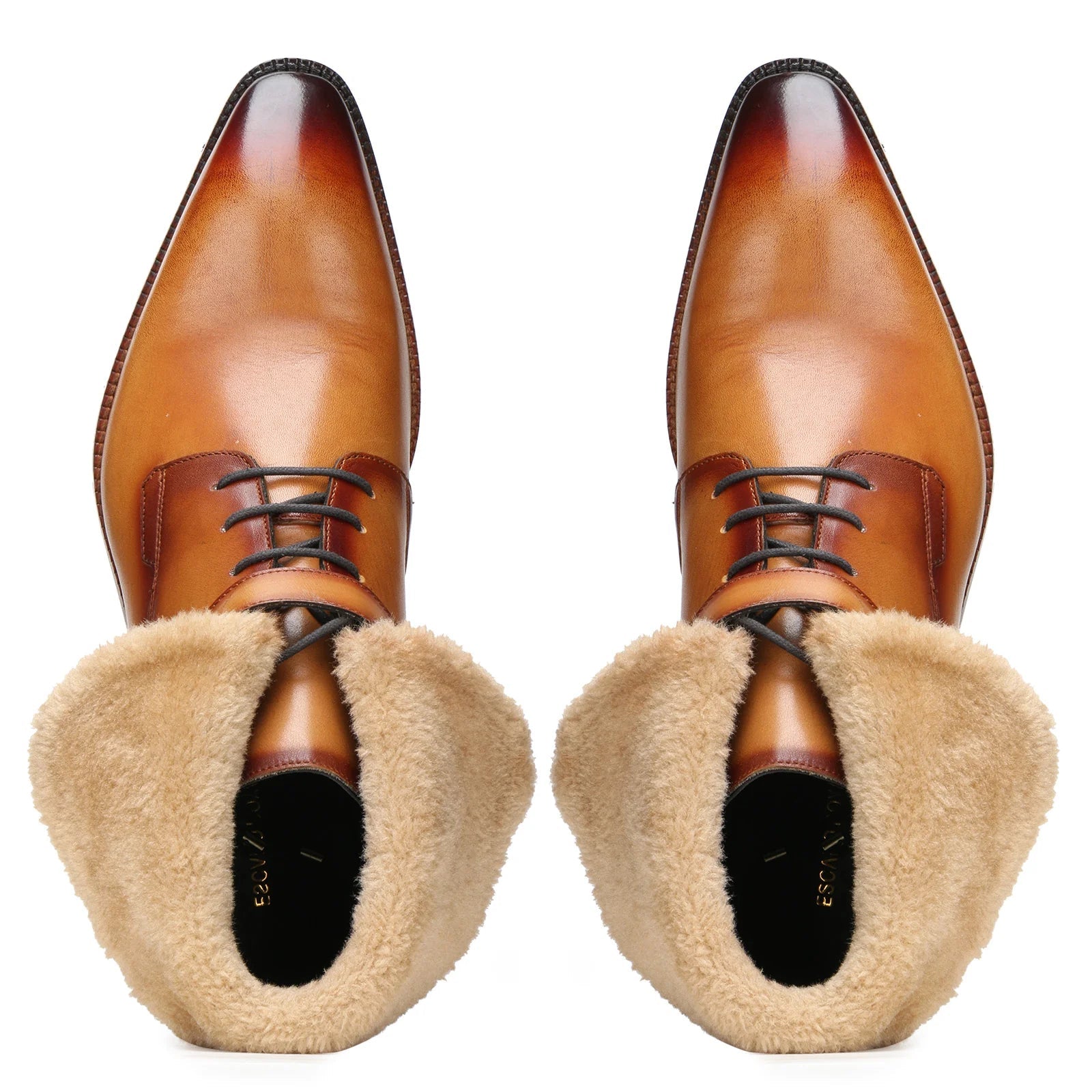 Crafted from deepcro-embossed Argentinian crust leather, adorned with a dual-tone hand patina, these boots are a symphony of elegance. The sleek Argentinian leather sole, genuine Blake stitched construction, and French sheepskin lining ensure enduring comfort. Luxurious ankle faux fur lining adds opulence to every step.